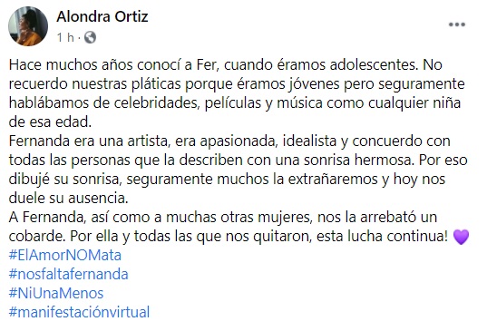 Algunas amistades de la joven también se despidieron de ella a través de Facebook: “Fernanda era una artista, era apasionada, idealista y concuerdo con todas las personas que la describen con una sonrisa hermosa. Por eso dibujé su sonrisa, seguramente muchos la extrañaremos y hoy nos duele su ausencia. A Fernanda, así como a muchas otras mujeres, nos la arrebató un cobarde. Por ella y todas las que nos quitaron, esta lucha continúa”, proclamó una usuaria.