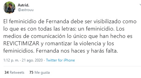“El feminicidio de Fernanda debe ser visibilizado como lo que es con todas las letras: un feminicidio. Los medios de comunicación lo único que han hecho es revictimizar y romantizar la violencia y los feminicidios. Fernanda nos haces y harás falta”, expresó una usuaria de Twitter.