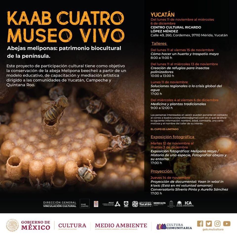 En Mérida, el Centro Cultural “Ricardo López Méndez” será sede del “KAAB Cuatro Museo Vivo”, una jornada de participación cultural –que se desarrollará también en Campeche– dedicada a la protección y conservación de la abeja Melipona beecheii que forma parte del patrimonio biocultural de la península.