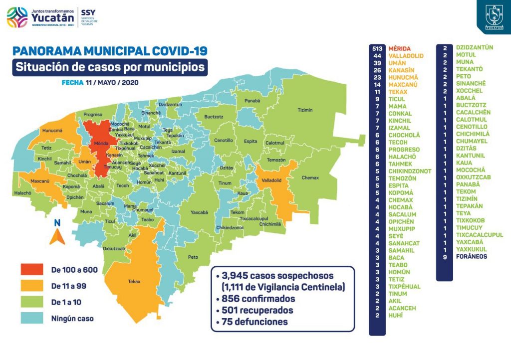 A la fecha, 847 personas de 67 municipios y nueve foráneas han dado positivo a la prueba de la enfermedad. Esta tarde se detectaron 19 nuevos contagios del virus: cinco en Mérida; dos en Hunucmá, Tixpéual y Umán; uno en Chocholá, Espita, Kanasín, Kinchil, Kopomá, Maxcanú, Mocochá y Muna.