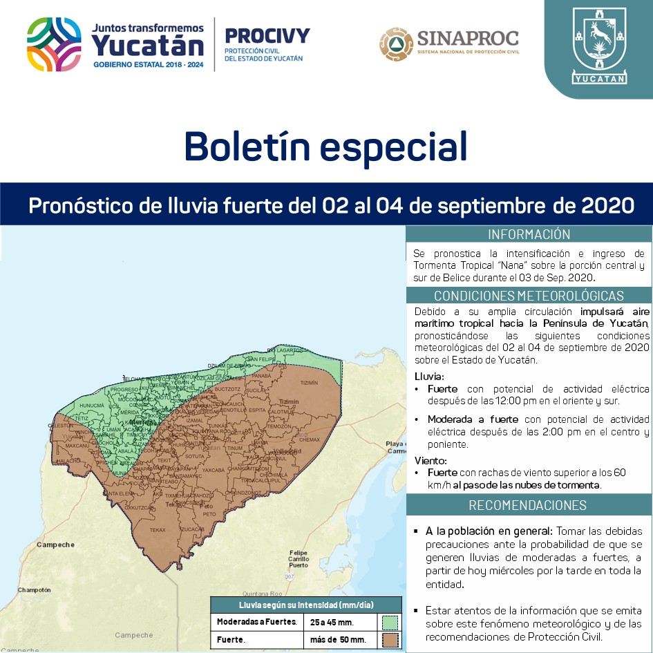 Mérida, Yucatán, 2 septiembre 2020.- Ante la influencia de la tormenta tropical Nana, que se encuentra cerca de Belice, la Coordinación Estatal de Protección Civil (PROCIVY), solicitó a la población a guardar precauciones por las lluvias que se esperan en algunos puntos de la entidad durante las próximas 48 horas.