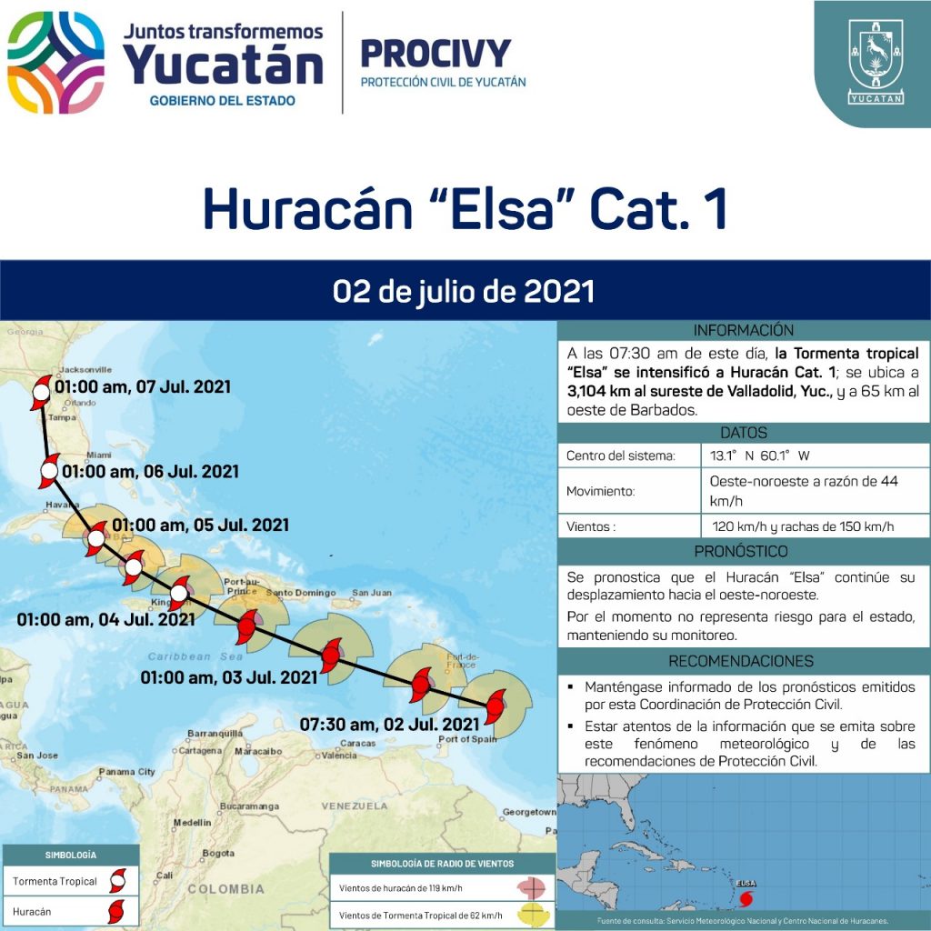 Conforme a registros del Servicio Meteorológico de la Comisión Nacional del Agua (Conagua), esta mañana, Elsa evolucionó a huracán categoría 1, ubicado a 65 kilómetros al oeste de Barbados y tres mil 104 al este de Valladolid, Yucatán, con vientos de 120 kilómetros por hora y rachas de 150.