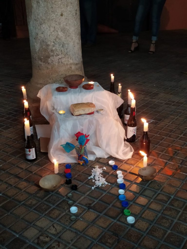 Posteriormente, el contingente se dirigió al Ayuntamiento, donde quitaron las vallas colocadas para proteger el edificio. También intervinieron ese recinto, con esténciles con la imagen de José Eduardo, y construyeron otro altar. Finalmente, exhibieron una manta con la leyenda “la policía se está cubriendo porque todos son asesinos y violadores”, en la Plaza Grande.