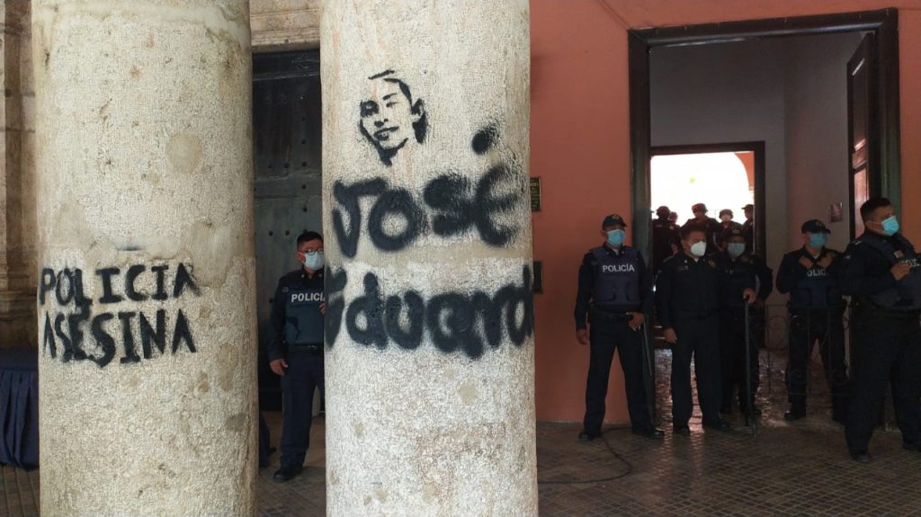 Mérida, Yucatán, 9 de agosto del 2021.- Bajo la consigna “la policía no me cuida, me viola y asesina”, decenas de personas protestaron ayer para exigir justicia para José Eduardo Ravelo Echevarría, conocido como “el Güero”, quien presuntamente fue asesinado y violado por agentes de la Policía Municipal de Mérida. Pidieron detener la violencia policial, así como sancionar los delitos de tortura y detenciones arbitrarias cometidos por los uniformados.