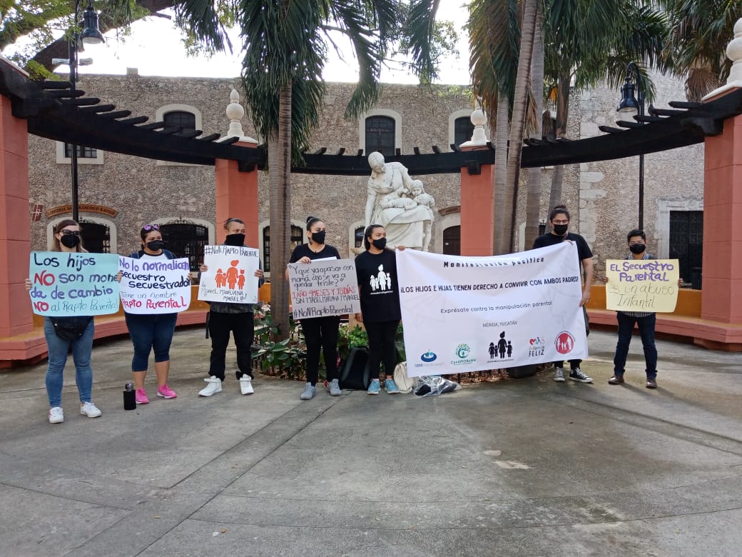 Mérida, Yucatán, 18 de marzo de 2021.- Una decena de personas se manifestaron esta mañana en el Parque de la Maternidad para exigir la inclusión del rapto parental en el Código Penal Federal, es decir, que se sancione a las madres o padres que se lleven a las o los hijos sin el consentimiento de la pareja.