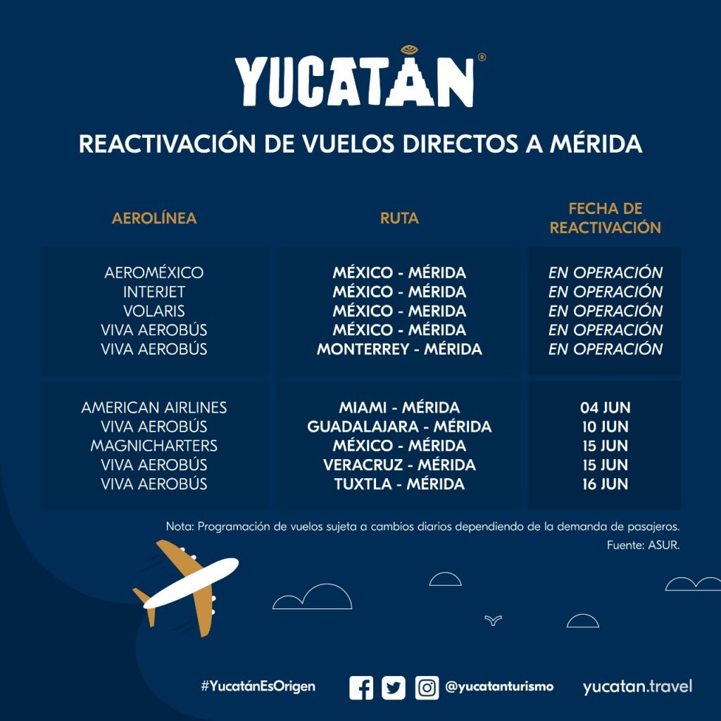 A partir de este 4 de junio, a través de American Airlines el vuelo directo desde Miami volverá a llegar a Mérida.También durante junio se reactivarán las rutas directas de Guadalajara, Veracruz y Tuxtla hacia Mérida con Viva Aerobús, y desde CDMX con Magnicharters.