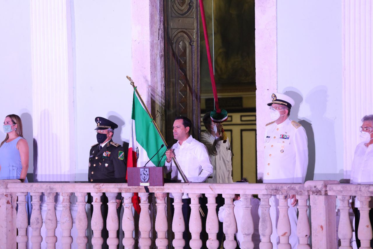 “¡Mexicanos, viva la independencia nacional!, ¡Vivan los héroes que nos dieron patria!, ¡Viva Hidalgo!, ¡Viva Morelos!, ¡Viva Guerrero!, ¡Viva Josefa Ortiz de Domínguez!, ¡Viva Yucatán!, ¡Viva la soberanía nacional!, ¡Viva México, viva México, viva México!”, exclamó Vila Dosal, para posteriormente hacer tañer la campana y ondear la bandera nacional.