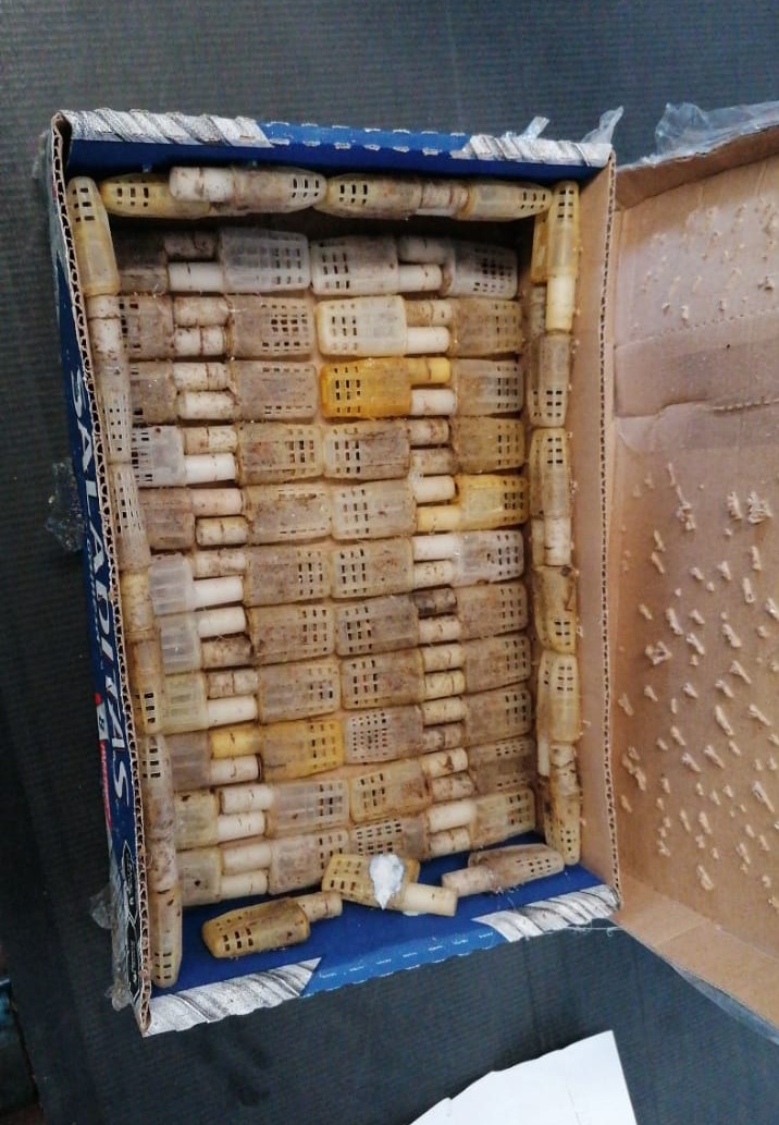 189 abejas africanas, reinas y overas fueron localizadas en una caja de cartón, sin el adecuado cuidado sanitario y documentación que acreditara su legal procedencia.