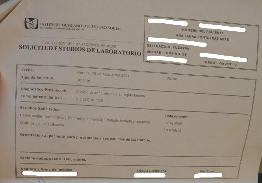 Pasaron los días, pero las molestias en el pie de la estudiante no disminuyeron. El 20 de agosto acudió a la UMF número 59 y ahí, tras hacerle estudios con rayos X, le confirmaron que todavía tenía una parte de la astilla enterrada.