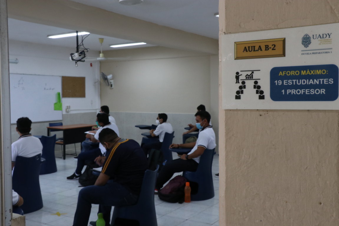 Es oportuno reiterar que la UADY instaló en las aulas todos los planteles un dispensador de gel antiséptico y se midieron los espacios para colocar la cantidad adecuada de sillas, manteniendo la distancia de 1.5 metros entre cada uno, además, se distribuyeron en toda la escuela lavabos y es obligatorio el uso constante de cubrebocas.